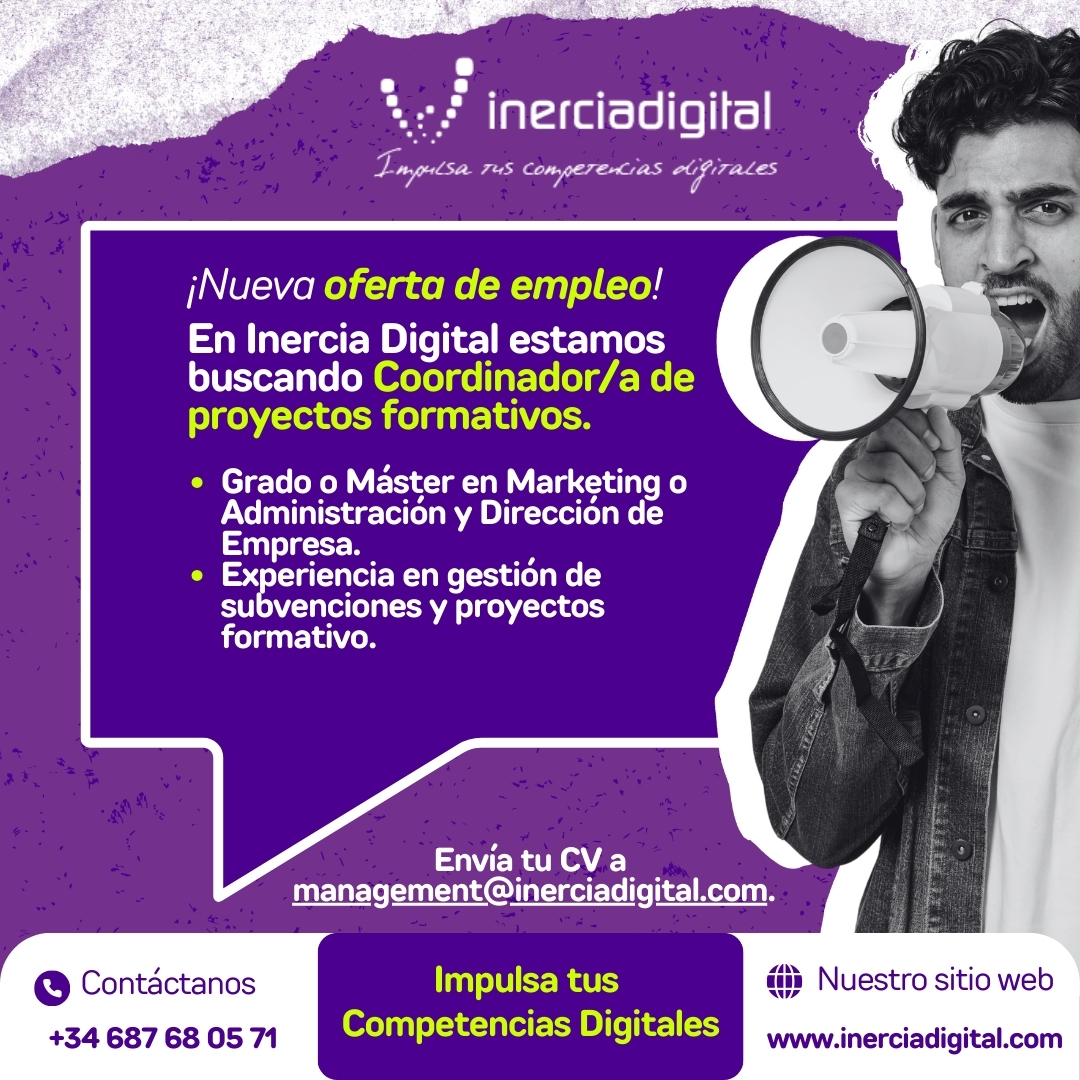 👉 Envíanos tu CV a management@inerciadigital.com con el asunto CV COORDINADOR/A DE PROYECTOS FORMATIVOS SUBVENCIONADOS para entrar en el proceso de selección. ¡Únete a Inercia Digital y sé parte de nuestro éxito!